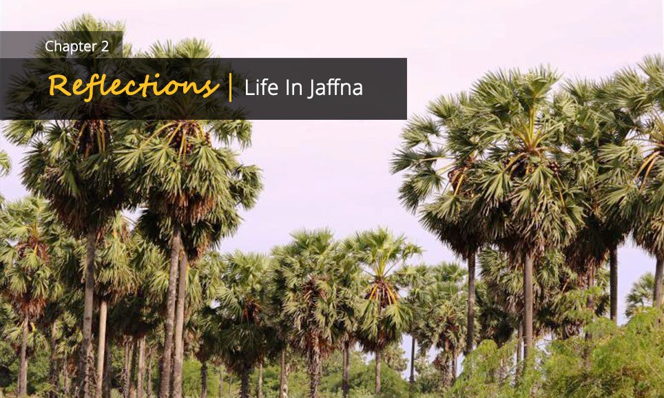 The palmyra tree held great fascination for me. While answering the call of nature, I would see dry leaves fall and hear the merry, rustling sound of young leaves dancing in the breeze. I remembered a Tamil saying I had heard on occasion without understanding why people said it. Translated literarily into English the saying was “When old leaves fall, young leaves laugh.” However, at home, I noted that old leaves were carefully used for our roof and fence and that cut up stems were used as fuel for cooking.